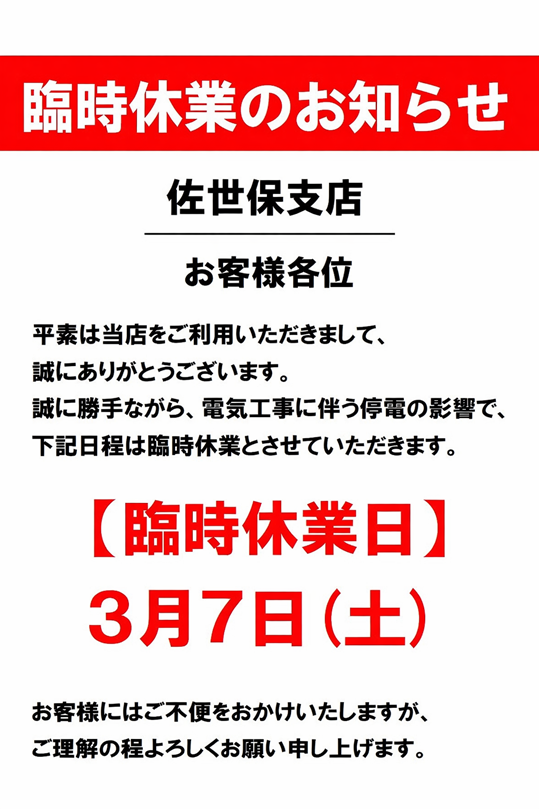 2024/01/09 *鮮鼓堂 伊万里支店・佐世保支店・諫早支店・みやき支店・有田支店 5店舗定休日のご案内。
